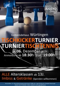 Wir sind Kispelkirche Wir richten den Blick nach außen und wir schaffen Raum für alle. Herzlich willkommen bei den nächsten Veranstaltungen unserer Gruppen und Kreise: Kreativer Abend für Frauen mit Buchvorstellung Kispelgottesdienst mit Abendmahl am Buß- und Bettag, 19.11.2025 Musikalischer Abendgottesdienst am 2. Advent Jungschar Turniertag Tischkicker / Tischtennis 06.12.2025 Kispelkirche – jetzt auch auf Instagram!